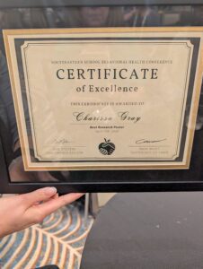 Congratulations to Charissa Gray, IMPACTT- NC Program Director, who was recently awarded “Best Research Poster” at the Southeastern School Behavioral Health Conference in Greenville, SC on April 17th. Charissa’s research project, entitled Expanding Utilization: District Telepresenters as Key Members of Virtual Behavioral Health Services, concludes that school districts that implement the use of telepresenters are likely to see higher utilization of services, less stress to the school district and increased provider satisfaction. Charissa is an active member of the Collaborative for the Advancement of School Telehealth (CAST).
